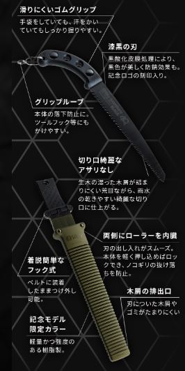 | Silky ゴムボーイ・ゴム太郎 40周年記念 限定モデル ●ゴムボーイ40周年を記念して、ミリタリー風オールブラック仕様の特別な限定モデルを記念発売 ・ゴムボーイブラック210/刃渡り:210mm、目数10枚目(30mm)、切幅:1.2mm 重量:250g (コンパネ・生木・剪定) ・ゴム太郎 ブラック240/刃渡り:240mm、目数8枚目(30mm)、切幅:1.3mm 重量:330g (生木・角材・造作) ・シルキーグリップループ標準装備(共通) |